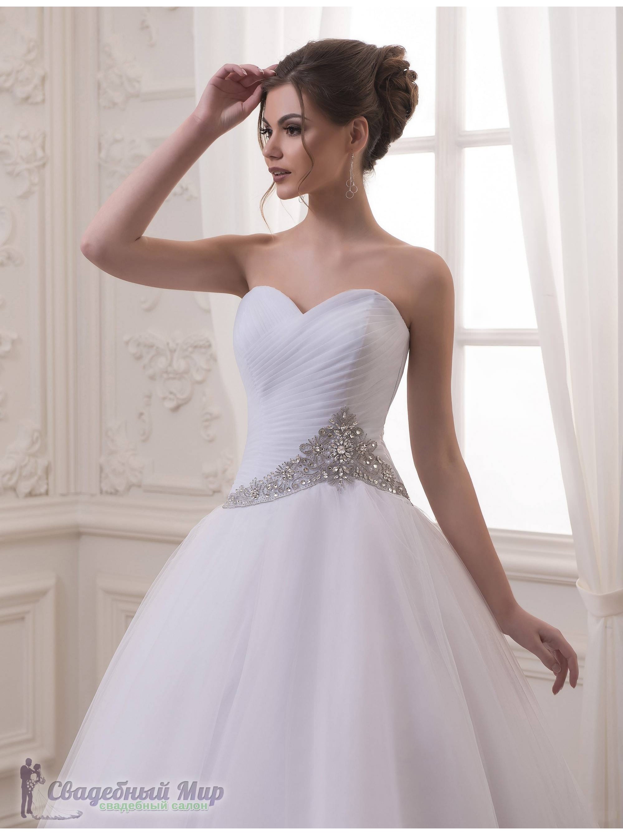 Воздушное платье для классического образа невесты. Декольте сердечком и драпированный корсет с открытыми плечами придаёт образу романтичности. Пышная фатиновая юбка струится вниз. Изюминкой платья является нежное украшение из страз на талии.