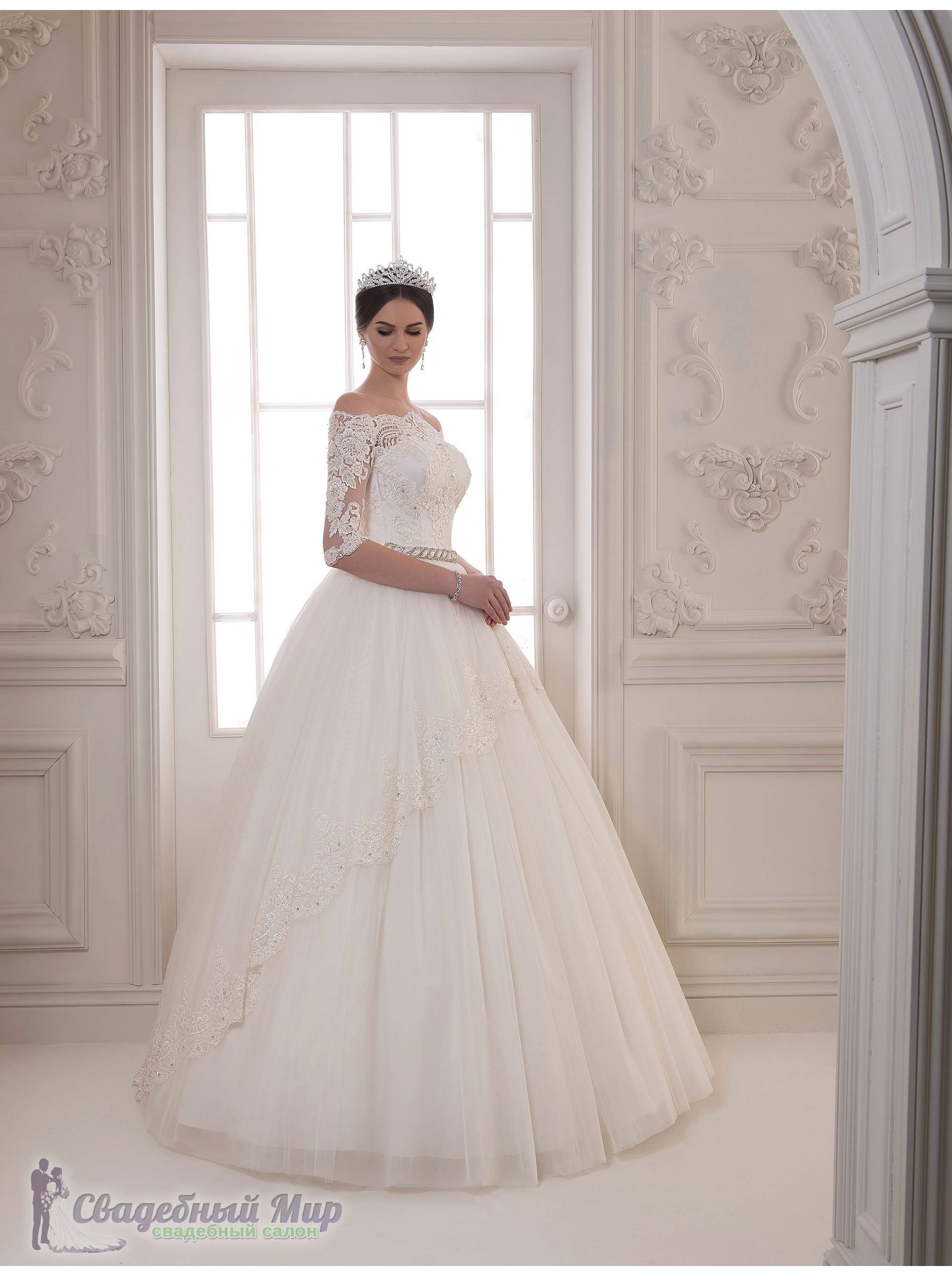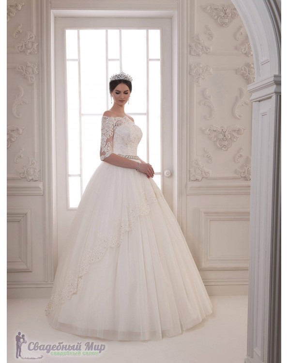 Воздушное свадебное платье. Кружевной полупрозрачный верх переходит на груди в облегающий корсет. Деольте оставляет открытыми шею и ключицы. На талии очень оригинальный пояс. Воздушная фатиновая юбка багато декорирована изысканной вышивкой.