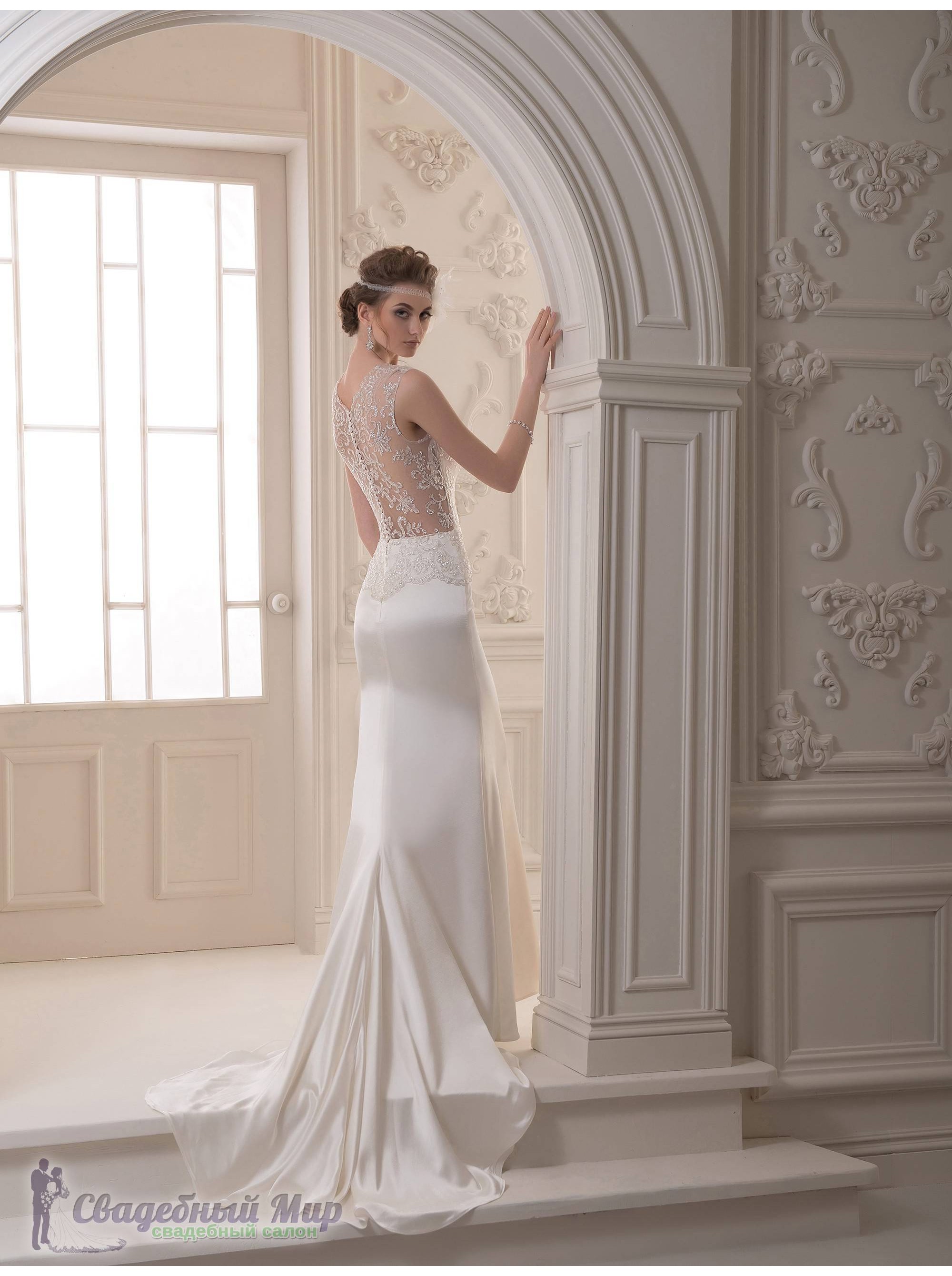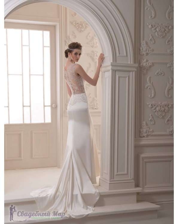 Необычное свадебное платье облегающего силуэта и отличающееся своей оригинальностью. Сверху кружевной топ прикрывает плечи и спину. Спереди прямая юбка доходит до пола, позади слегка расширяется и образует небольшой шлейф. Талия украшена оригинальным пояском.