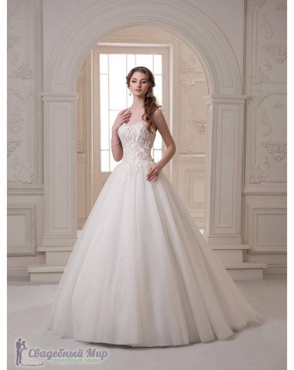 Кокетливое свадебное платье. Оно эффектно выглядит благодаря белоснежному кружеву, наложенному на основу телесного цвета. Кружевной декор с лифа переходит на воздушную юбку, которая сзади переходит в шлйф. Открытые плечи, глубокое декольте, богатый декор - дополняют образ.