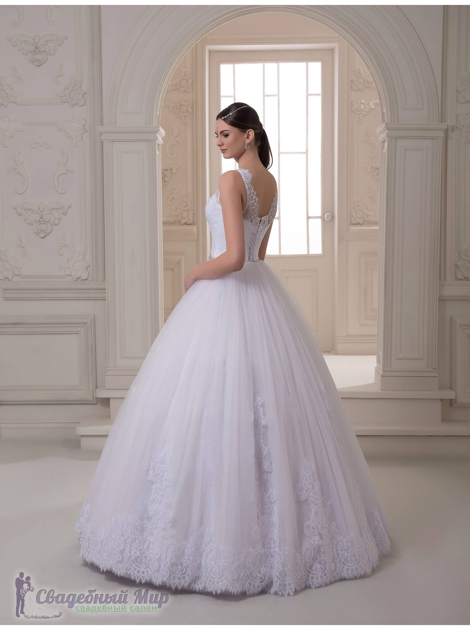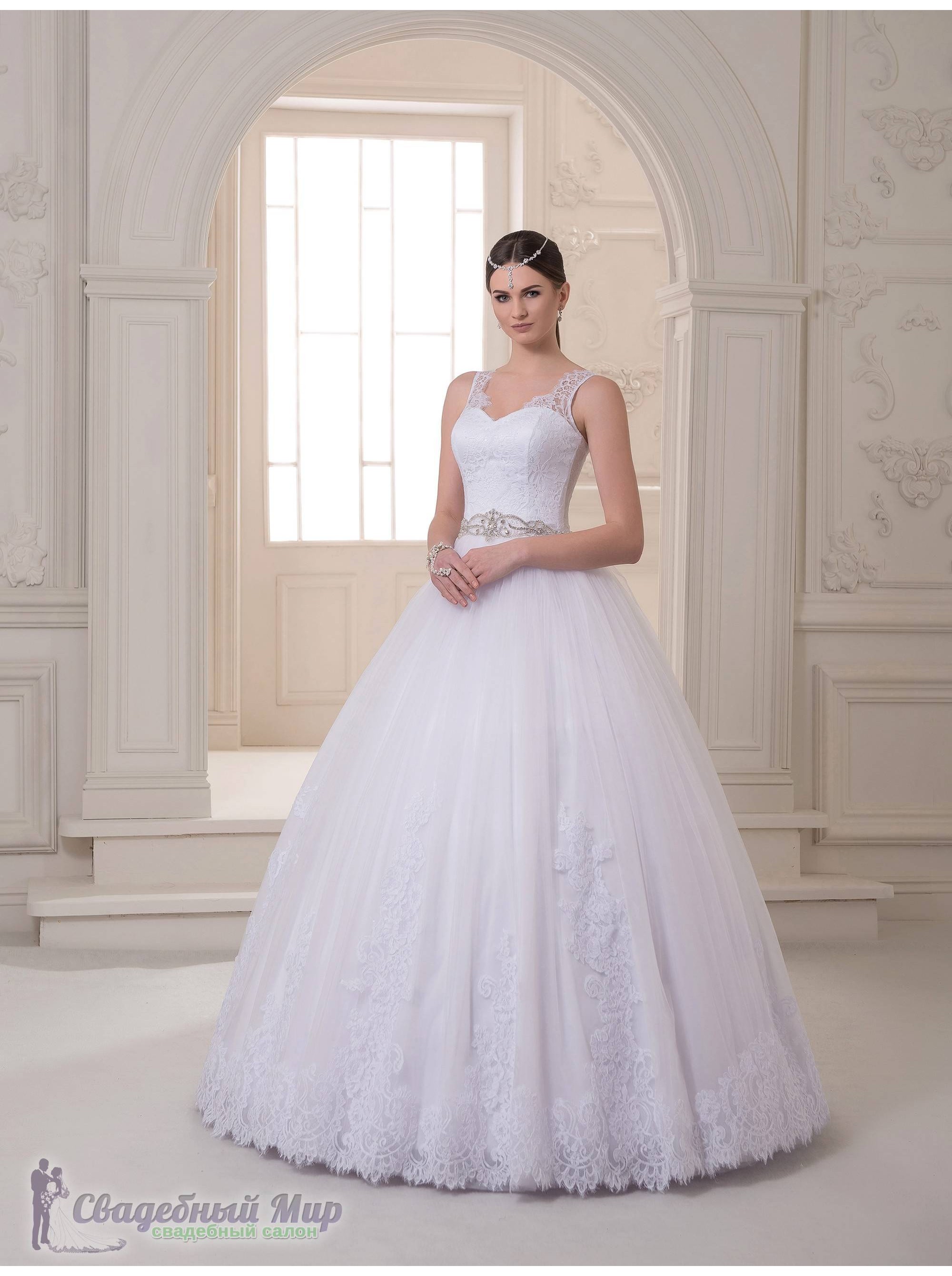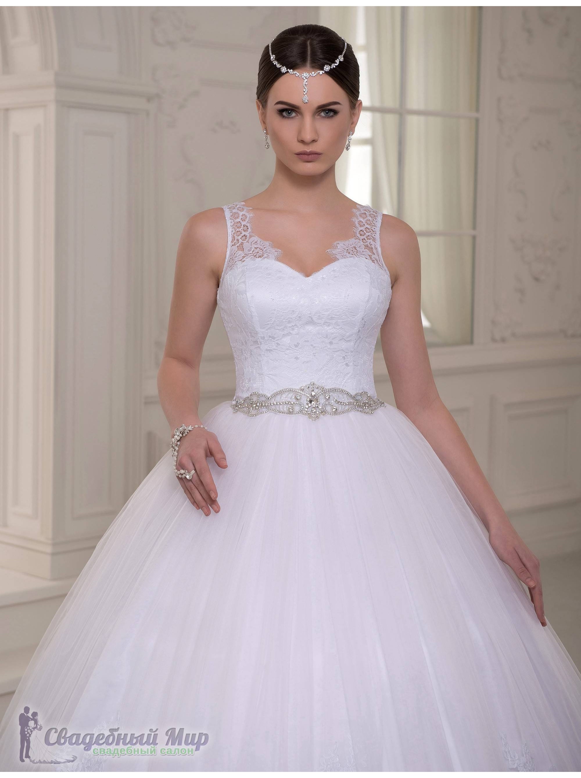 Соблазнительная модель свадебного платья. Чётко очерчивающий фигуру корсет покрыт гипюром. Штрокие кружевные бретели делают акцент на красивой линии груди и плеч. Многослойная фатиновая юбка декорирована кружевными аппликациями. Талия украшена стразами.