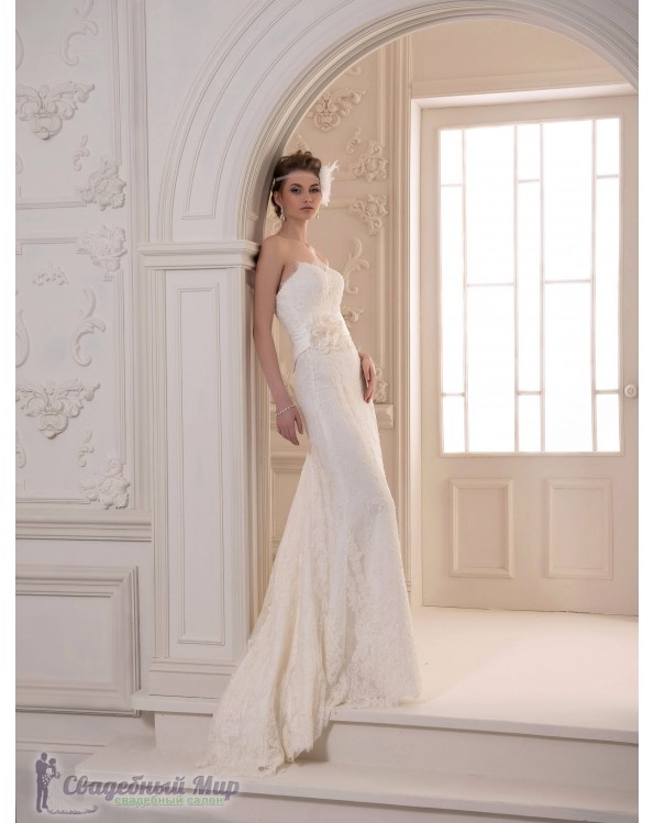 Элегантная модель свадебного платья пряиого кроя. Лиф, открывающий плечи и спину, подчёркивает красивую зону декольте. Верхний слой платья - нежное кружево. Талию украшает широкий пояс с композицией из крупных цветов.Главную роль в простом фасоне играет украшенный шлейфом подол.