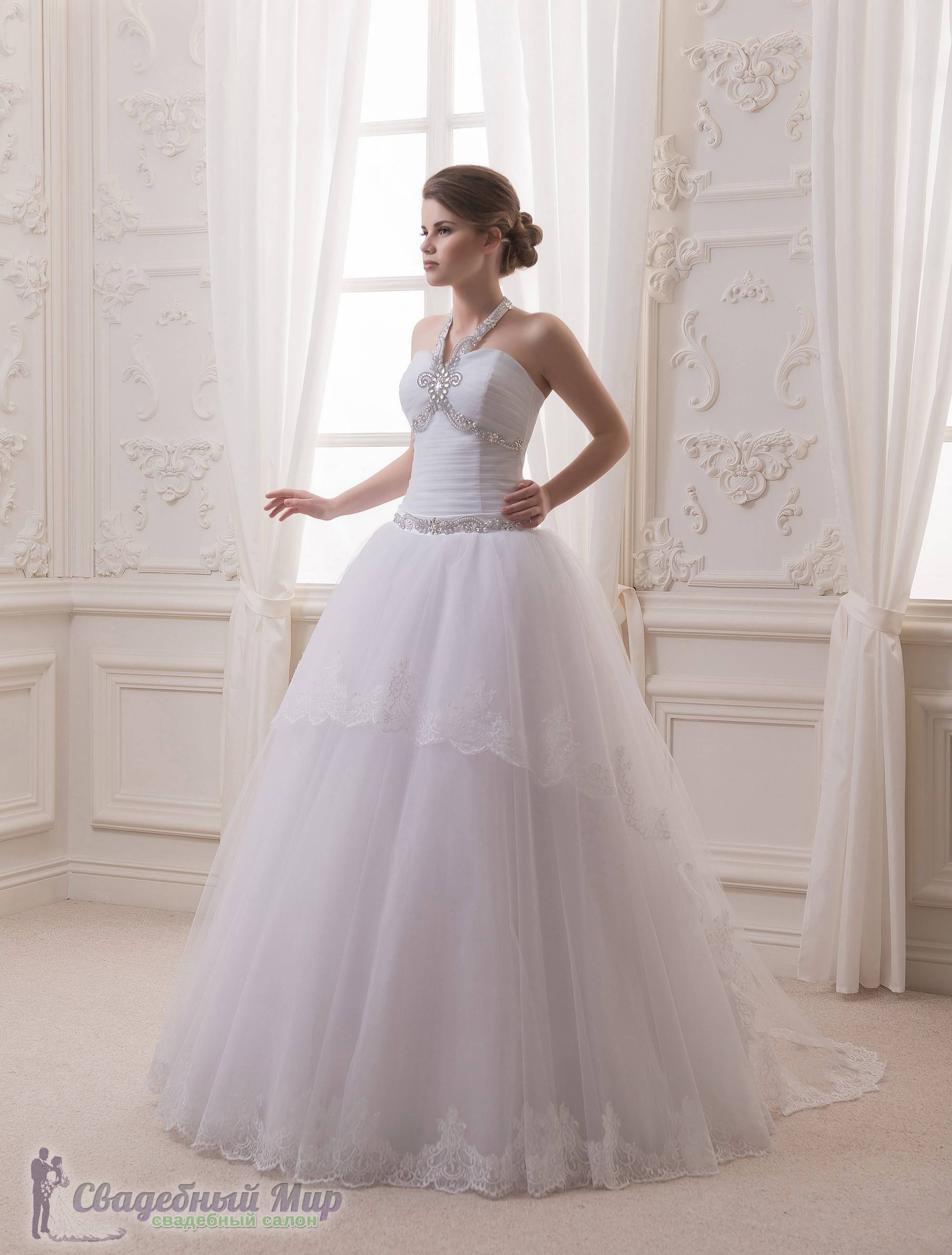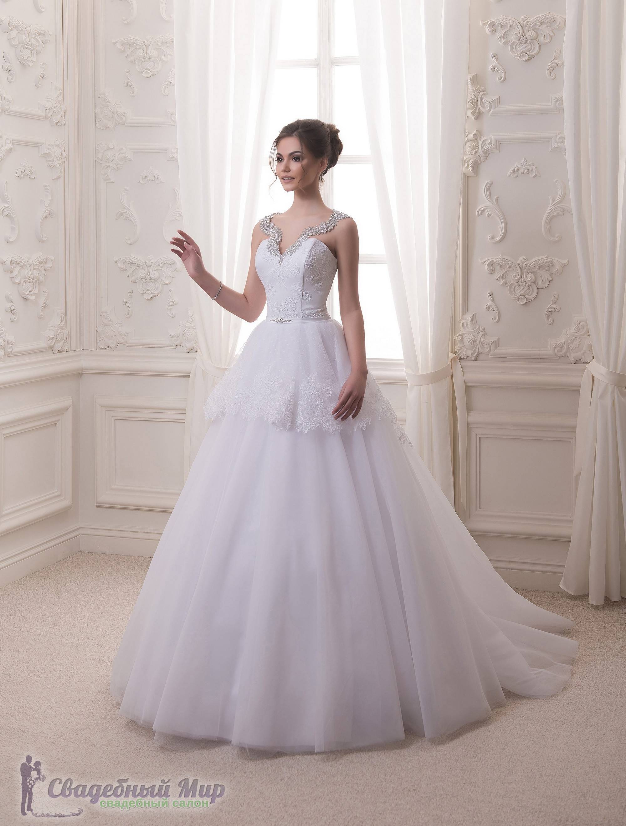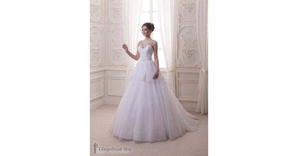 Шикарное модель свадебного платья. Утончённый свадебный образ дополняет изящное декольте с оригинальными стразовыми бретелями. Воздушная фатиновая юбка со шлейфом дополено кружевным воланом. Талия украшена тонким поясом. ..Цену уточняйте