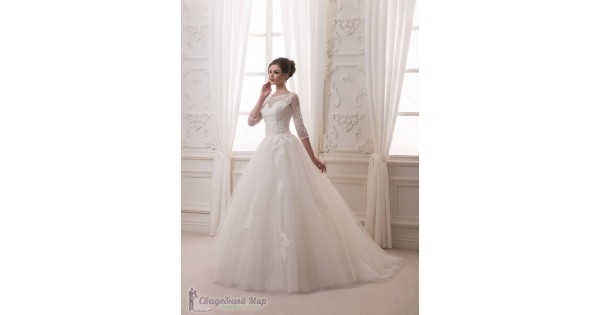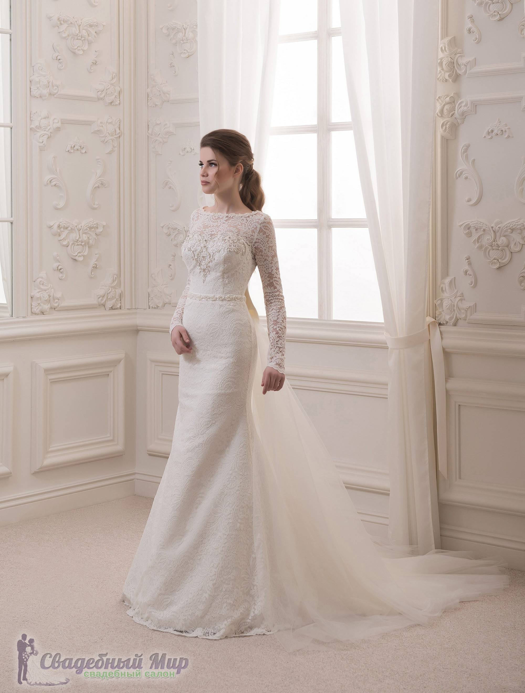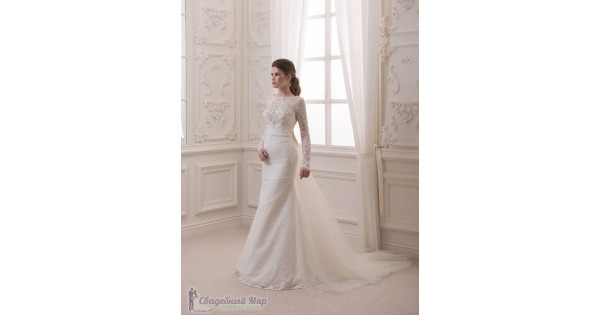 Восхитительная модель свадебного платья. Кружевной корсет с длинными рукавами и глухим вырезом. На талии декоративный пояс со стразами. Спинка украшена пуговичками. Дополняет образ отстёгивающийся фатиновый шлейф с бантом. ..Цену уточняйте
