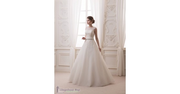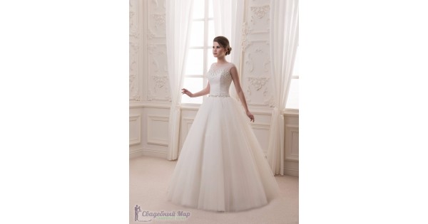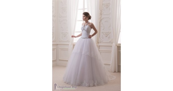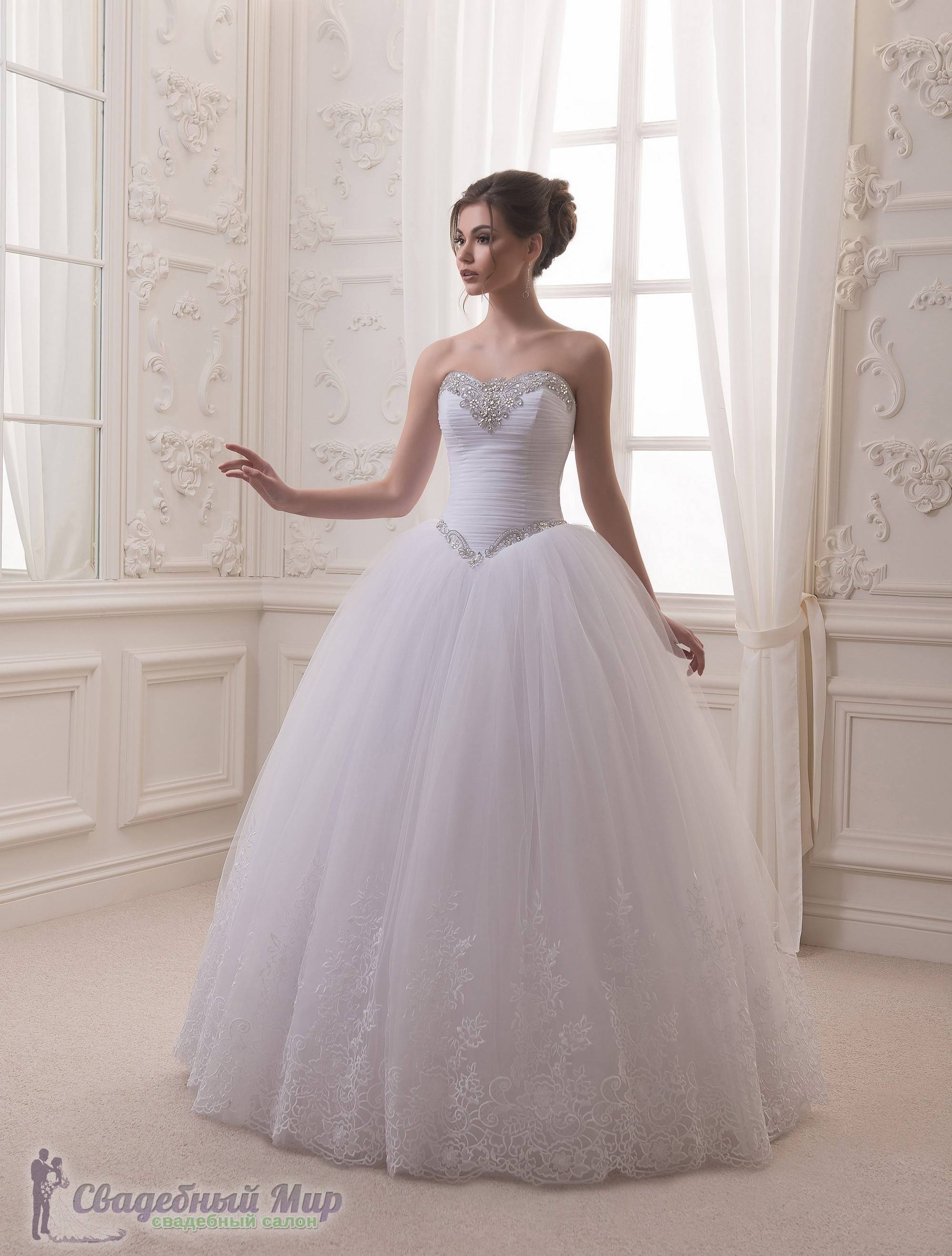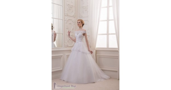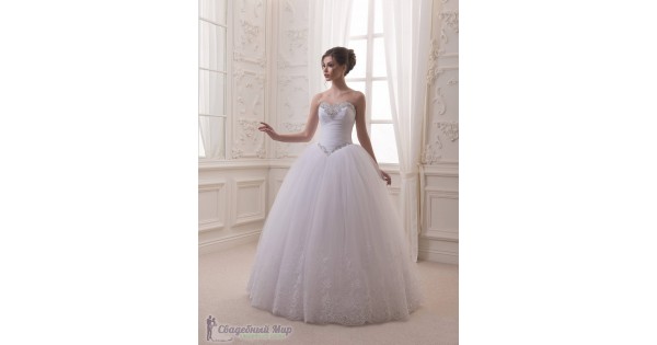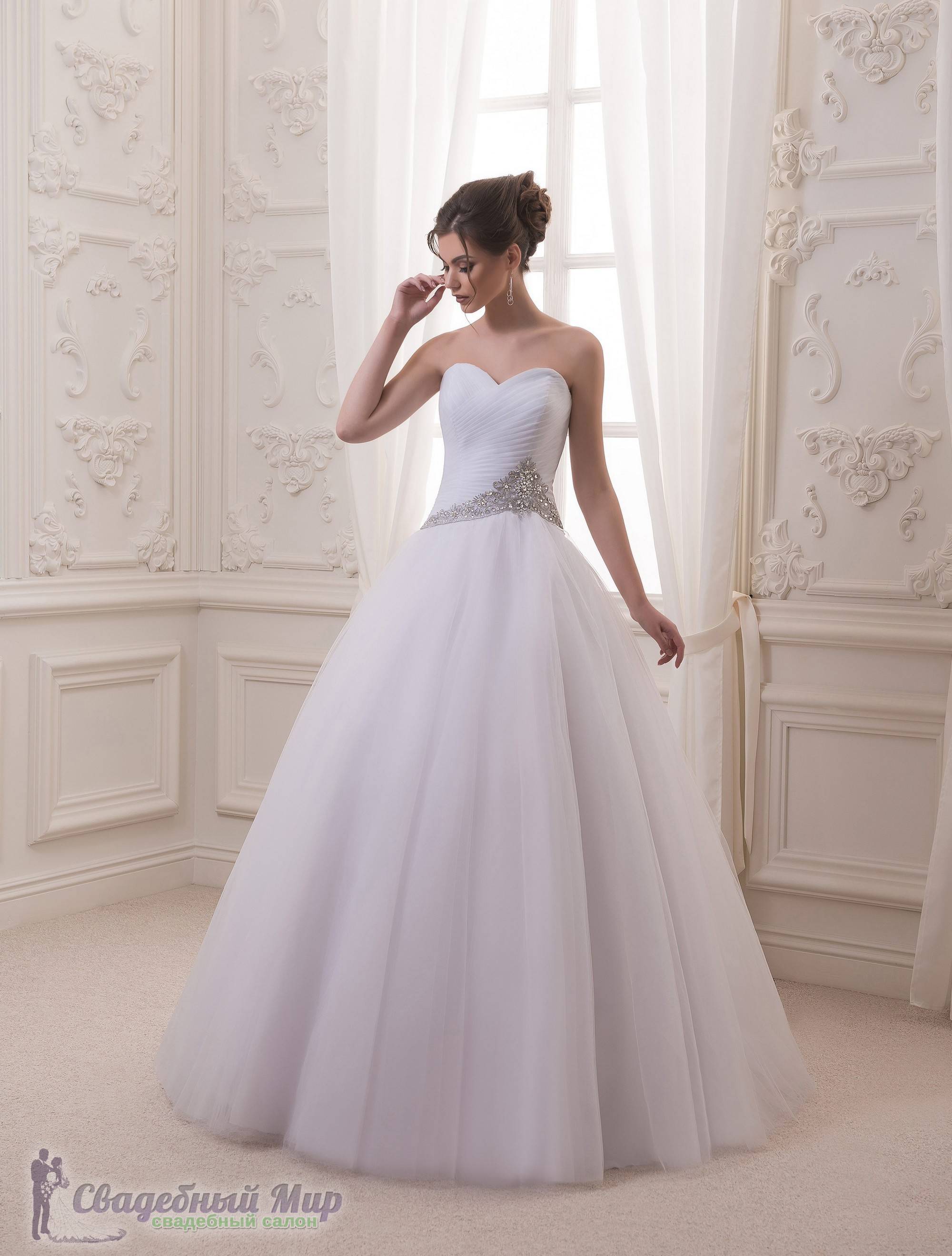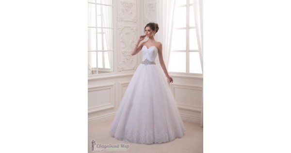 Воздушное платье для классического образа невесты. Декольте сердечком и драпированный корсет с открытыми плечами придаёт образу романтичности. Пышная фатиновая юбка струится вниз. Изюминкой платья является нежное украшение из страз на талии. ..Цену уточняйте