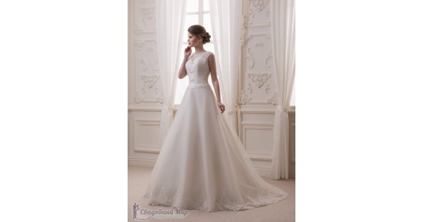 Чувственное свадебное платье с воздушной фатиновой юбкой. Плотно облегающий гипюровій корсет украшен оригинальным узором из страз. Почти невидимая маечка формирует вырез "лодочка". Талия украшена поясмо, формирующий бант сзади. ..Цену уточняйте