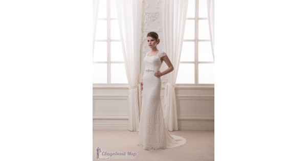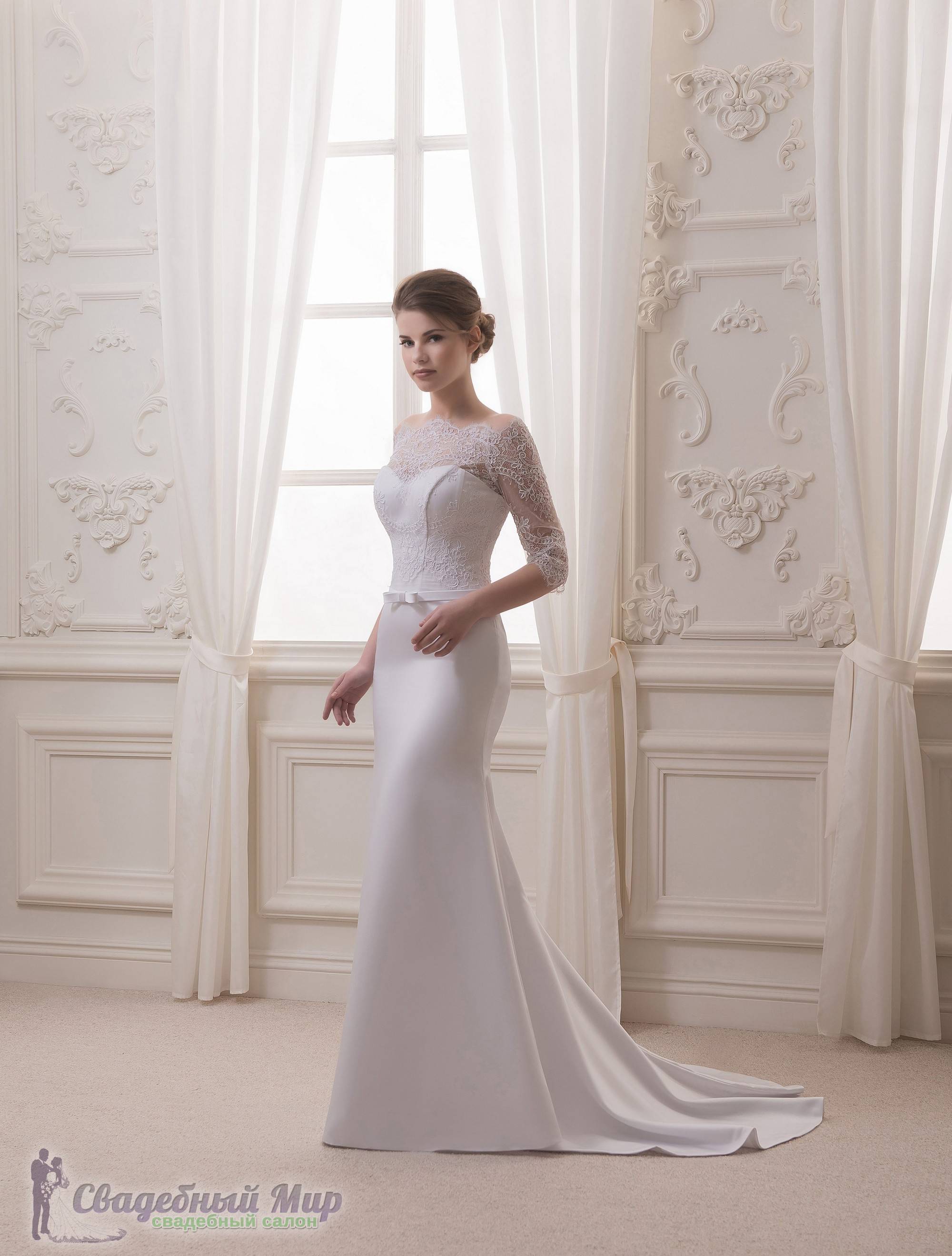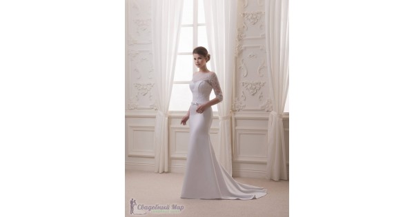 Облегающая модель свадебного платья. Атласная юбка заканчивается элегантнымдлинным шлейфом. Гипюровый корсет плотно облегает фигуру. Сверху линия декольте прикрыта гипюром, образуя рукавчик 3/4. Пояс акцентирован тоненьким пояском с бантиком. ..Цену уточняйте