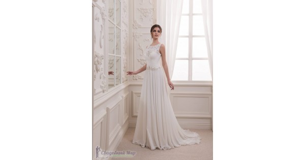 Женственное свадебное платье с роскошным шлейфом. Корсет мелко задрапирован и украшен по лифу и талии нежным узором из мелких жемчужинок. Верх платья выполнен в виде закрытой кружевной майки. Юбка сшита из стуящегося шифона со шлейфом. ..Цену уточняйте
