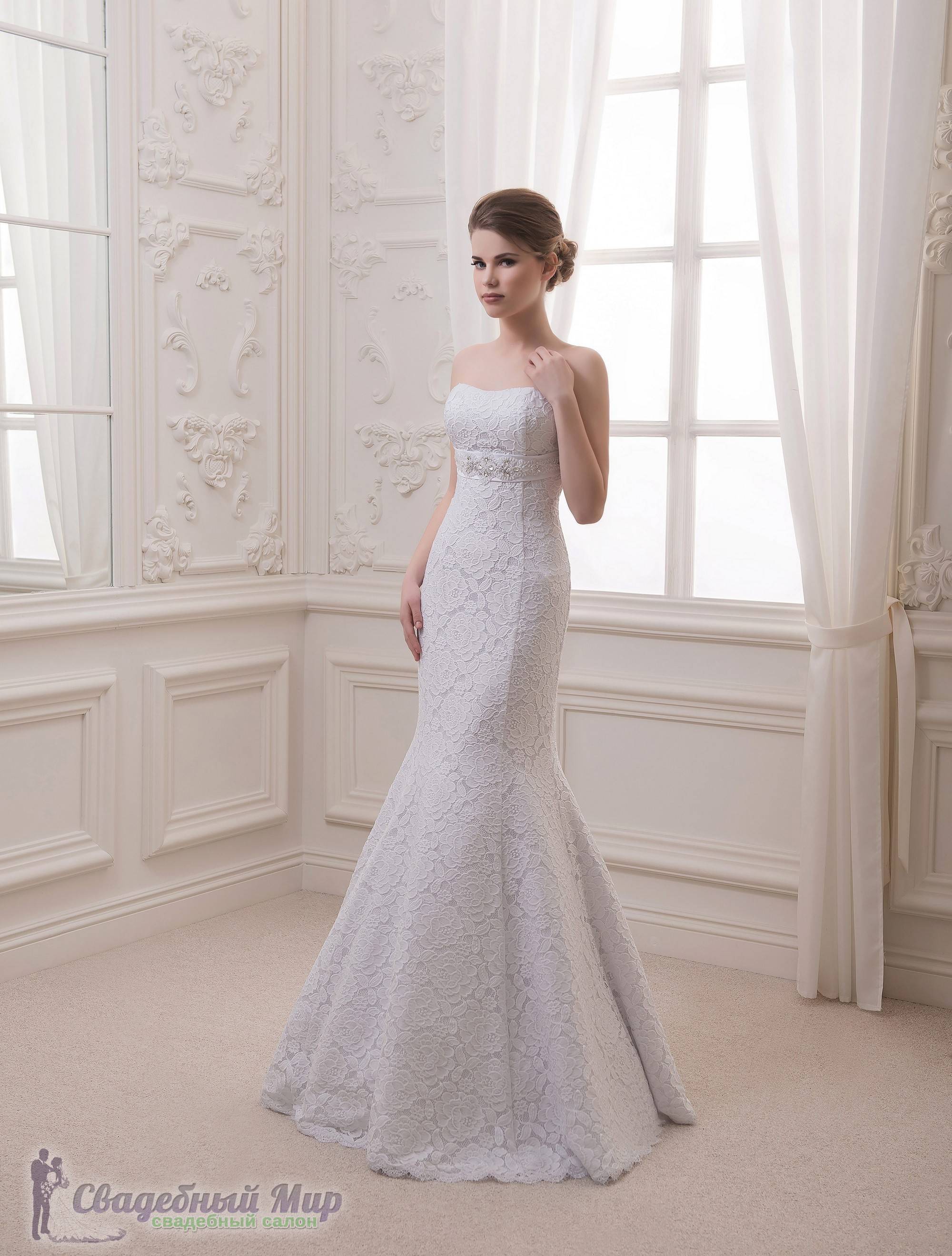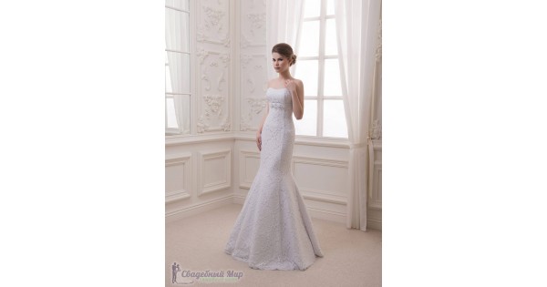 Элегантное свадебное платье сшито из густого кружевного полотна. Линия лифа кокетливо изогнута. Под грудью расположен широкий пояс расшитый стразами. Плечи и грудь открыты. Платье ассоциируется с образом рыбки. ..Цену уточняйте