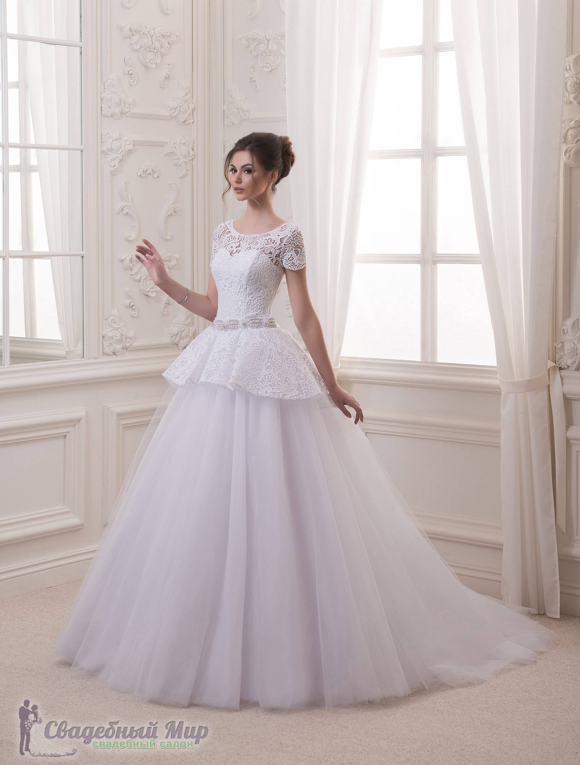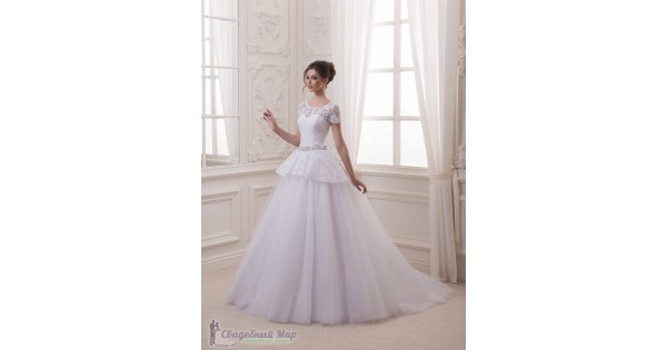 Оригинальное свадебное платье с кружевной баской. Пышная фатиновая юбка со шлефом. Романтичный образ невесты создаёт нежный кружевной корсет с коротким руковичком. Дополняет образ поясок из камней. ..Цену уточняйте