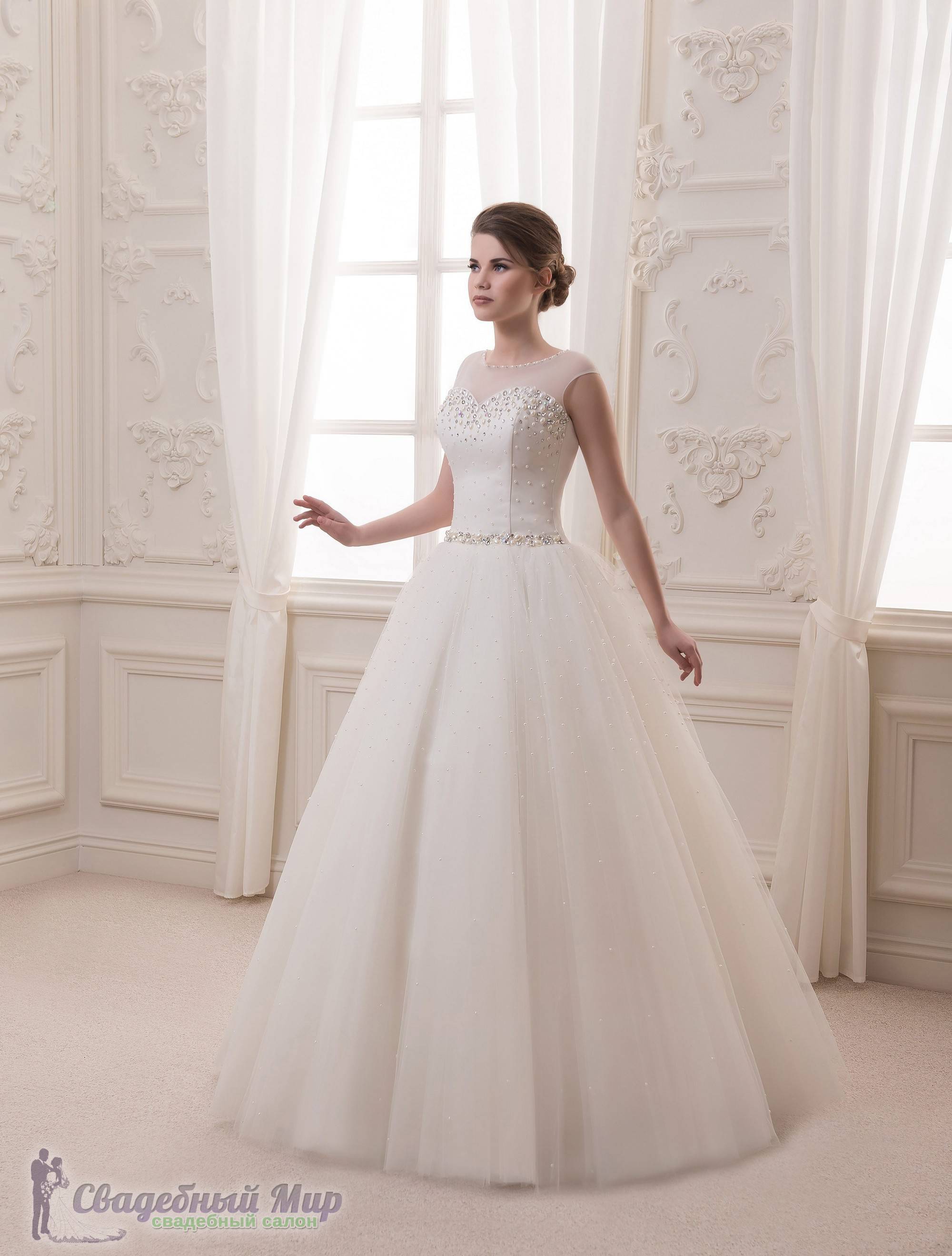 Гармоничное свадебное платье. Акцентной зоной платья является декольте, подчёркнутое драпировкой. Также очень гармонично смотриться стразовая отделка. Дополняет образ пышная фатиновая юбка. ..Цену уточняйте